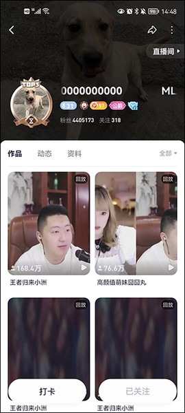 3、在主播的个人空间里,别忘了点个“关注”,这样下次开播就能及时收到提醒,主播的作品里就包含了回放视频哦。