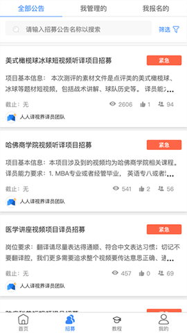 人人译视界app是一款全能的多语种视频翻译互动娱乐平台,致力于为用户带来丰富多彩的视听盛宴。基于人人影视字幕组团队的精英翻译实力,这个应用结合了用户的实际需求和全球海量高清视频资源,涵盖社会、娱乐、搞笑、生活等十个大类,支持英语、法语、日语、德语、意大利语等八种语言。不论你是哪个国家的内容爱好者,都可以轻松找到自己喜欢的视听内容,领略世界万象。更妙的是,你还可以参与线上视频翻译,与众多翻译高手互动交流,结交志同道合的朋友,一起为精彩世界贡献自己的力量!不如现在就动手下载体验一下吧~